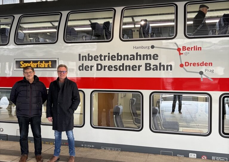 Auch unsere Kollegen Steffen Schuster, Ralph Freudenberg und Manfred Sperling, die dieses Projekt über viele Jahre begleitet haben, folgten der Einladung der DB InfraGO und freuten sich bei der Sonderfahrt über die Realisierung dieses wichtigen Ausbauprojekts mit länderübergreifender Bedeutung.
